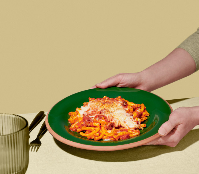 Un plat de penne créatif avec des morceaux de poulet grillé croustillants et une sauce tomate crémeuse au mascarpone, avec une croustillante couche d’emmental gratinée sur le dessus.