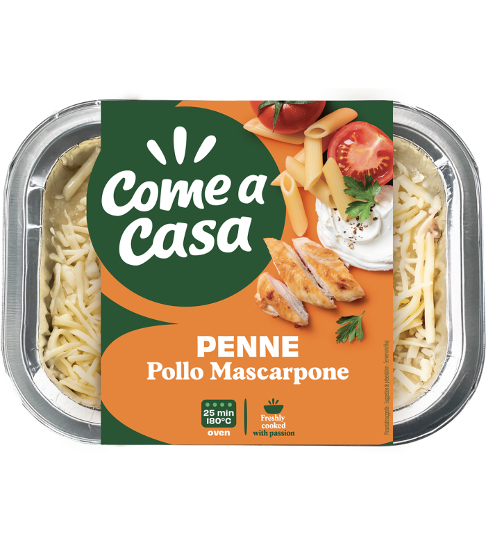 Pennes cuits 24% (semoule de BLÉ dur, eau, blanc d'OEUF d'élevage au sol, huile de colza, sel), tomates 16%, eau, LAIT écrémé, poulet rôti 12% [filet de poulet, LACTOSE, antioxydant (citrates de sodium), sel, protéines de SOJA, stabilisant (triphosphates), gélifiant (carraghénanes), protéines de LAIT], mascarpone (contient LAIT) 4,5%, FROMAGE, amidon modifié, huile de colza, arômes (contient CÉLERI), oignon, CRÈME, gélatine de porc, sucre, sel, plantes aromatique, épices, fécule, ail. Peut contenir POISSON.