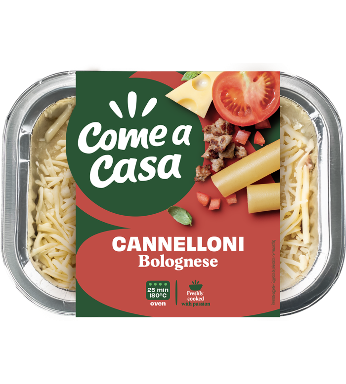 Lekkere rolletjes verse pasta opgevuld met pittig gekruid varkensvlees. Het gerecht is overgoten met een tomatensaus op basis van olijfolie met lekkere stukjes knapperige mediterrane groenten zoals worteltjes, courgettes en tomaat. De emmental kaas als topping zorgt voor een krokant korstje.